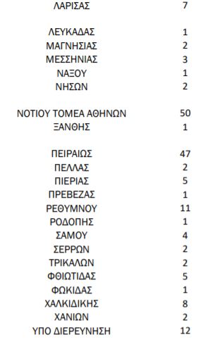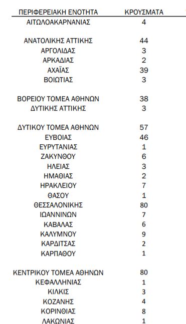 Αναλυτικά σε όλες τις περιοχές της χώρας εντοπίζονται τα εξής κρούσματα: