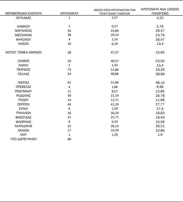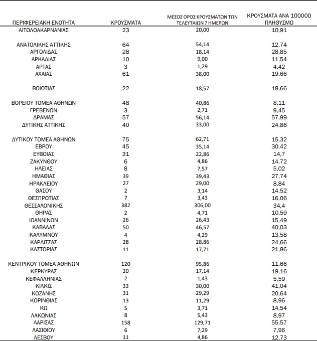 Η Αττική καταγράφει 488 κρούσματα, ενώ στη Θεσσαλονίκη εντοπίστηκαν 382. Σε ιδιαίτερα υψηλά επίπεδα παραμένει η Λάρισα με 158.