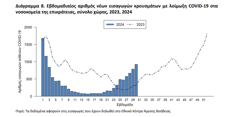 Αυξημένη δραστηριότητα του ιού, με αυξητική τάση στις εισαγωγές για νοσηλεία, καταγράφουν και αυτήν την εβδομάδα τα στοιχεία του ΕΟΔΥ για τον κορονοϊό και τη νόσο Covid, σύμφωνα με την τελευταία Εβδομαδιαία Έκθεση Επιδημιολογικής Επιτήρησης Αναπνευστικών Λοιμώξεων που έδωσε στη δημοσιότητα ο Οργανισμός για την Εβδομάδα 30/2024 (22 Ιουλίου 2024 – 28 Ιουλίου 2024).