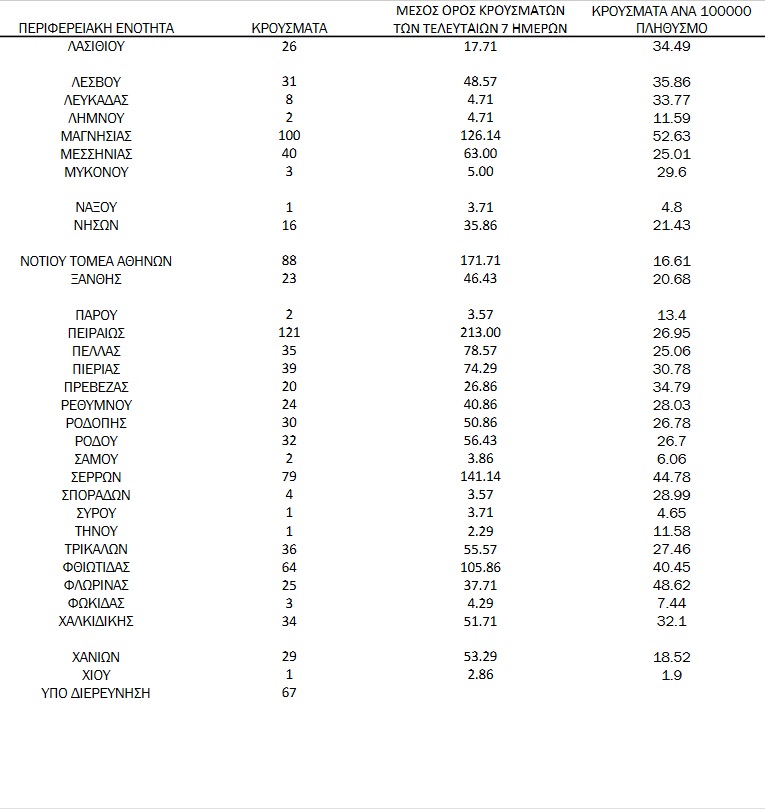 Από τα 3.526 νέα κρούσματα που καταγράφηκαν στην Ελλάδα το τελευταίο 24ωρο, τα 1.016 είναι στην Αττική και τα 577 στη Θεσσαλονίκη. Εκτός από αυτές τις δύο περιοχές, τριψήφιος αριθμός νέων κρουσμάτων, καταγράφηκε επίσης στις εξής περιφερειακές ενότητες: