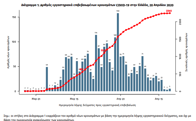Τα νέα επιβεβαιωμένα εργαστηριακά κρούσματα της νόσου στις 20/4/2020 ήταν 10. Ο συνολικός αριθμός των κρουσμάτων ανέρχεται σε 2245 (ημερήσια μεταβολή +0.4%), εκ των οποίων 56.1% άνδρες.