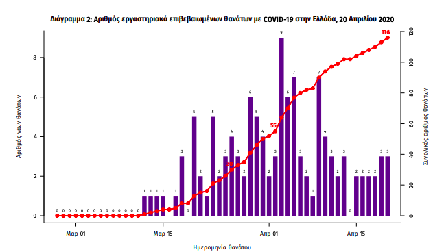 Οι νέοι καταγεγραμμένοι θάνατοι ασθενών με COVID-19 στις 20/4/2020 ήταν 6, ενώ από την έναρξη της επιδημίας έχουν καταγραφεί συνολικά 116 θάνατοι. (Από το βράδυ της Δευτέρας του Πάσχα προστέθηκαν ακόμη τρεις θάνατοι, δηλαδή 119 στο σύνολο).