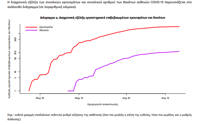 Η διαχρονική εξέλιξη των συνολικών κρουσμάτων και συνολικού αριθμού των θανάτων ασθενών COVID-19 παρουσιάζεται στο ακόλουθο διάγραμμα (σε λογαριθμική κλίμακα). Η επιδημική καμπύλη είναι πλέον σχεδόν ευθεία.
