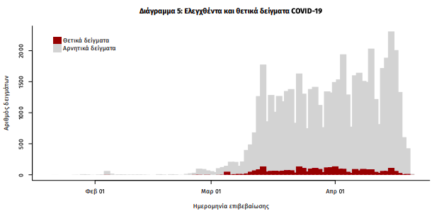 Δείγματα που έχουν ελεγχθεί στα συνεργαζόμενα με τον ΕΟΔΥ εργαστήρια: Από την 1η Ιανουαρίου 2020 μέχρι σήμερα, στα εργαστήρια που διενεργούν ελέγχους για τον νέο κορωνοϊό (SARS-CoV-2) και που δηλώνουν συστηματικά στον ΕΟΔΥ το σύνολο των δειγμάτων που ελέγχουν (θετικά και αρνητικά), έχουν συνολικά ελεγχθεί 54344 κλινικά δείγματα, εκ των οποίων τα 3079 (5.7%) ήταν θετικά στον κορωνοϊό.