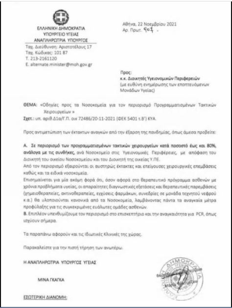 Με έγγραφο που υπογράφει η αναπληρώτρια Υπουργός Υγείας, Μίνα Γκάγκα, ζητείται από τους διοικητές όλων των Υγειονομικών Περιφερειών, να φροντίσουν άμεσα «στον περιορισμό των προγραμματισμένων τακτικών χειρουργείων κατά ποσοστό έως και 80% ανάλογα με τις συνθήκες, ανά Νοσοκομείο στις Υγειονομικές Περιφέρειες»