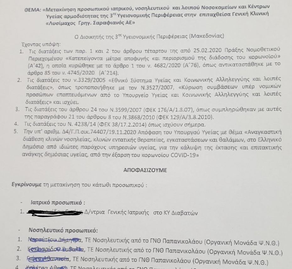 Συγκεκριμένα, μετακινεί 11 άτομα, γιατρούς, νοσηλευτές και διοικητικό προσωπικό από το νοσοκομείο «Παπανικολάου» και «Άγιος Δημήτριος» προς την ιδιωτική κλινική «Σαραφιανός», για όσο διάστημα διαρκεί η επίταξη.
