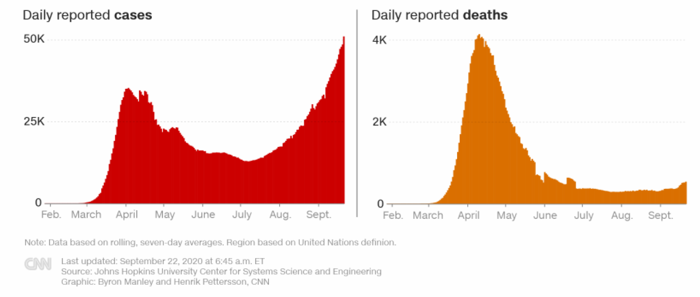 Η Βουλγαρία, η Κροατία, η Μάλτα, η Ρουμανία και η Ισπανία έχουν αρχίσει να βλέπουν συνεχείς αυξήσεις των θανατηφόρων περιστατικών. Παρόμοια εικόνα εμφανίζει τελευταία και η Ελλάδα, με τον αριθμό “ρεκόρ” του δεύτερου κύματος της πανδημίας να σημειώνεται την περασμένη Πέμπτη 24/9, με 9 θανάτους μέσα σε ένα 24ωρο από τον ιό SARS-CoV-2.