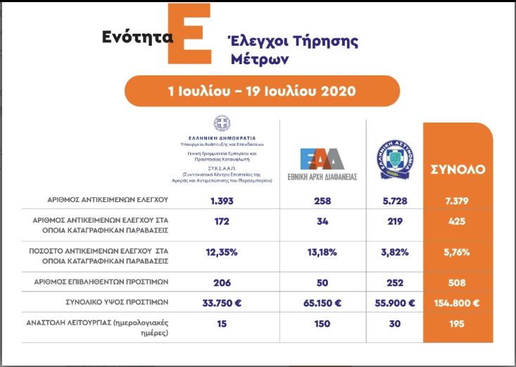 Τα πρόστιμα και οι ημέρες αναστολής καταστημάτων από τους ελέγχους τήρησης των μέτρων προστασίας του κορονοϊού Πρόστιμα 33.750 ευρώ έκοψε και το Συντονιστικό Κέντρο Εποπτείας της Αγοράς και Αντιμετώπισης του Παραεμπορίου του υπουργείου Ανάπτυξης. Διευκρινίζεται ότι πραγματοποιήθηκαν συνολικά 7.379 έλεγχοι, στους οποίους καταγράφηκαν 425 παραβάσεις και επιβλήθηκαν 508 πρόστιμα. Αναστολή λειτουργίας Την ίδια στιγμή επιβλήθηκαν συνολικά και από τις τρεις αρμόδιες αρχές, 195 ημέρες αναστολής λειτουργίας καταστημάτων, με την Εθνική Αρχή Διαφάνειας να έχει επιβάλει τις 150. Πηγή: Protagon.gr