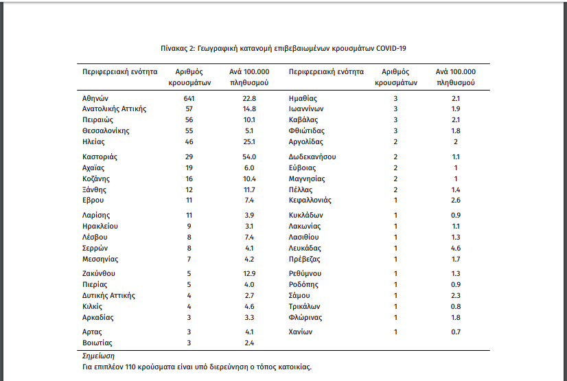 Ο νομός της Αττικής διατηρεί το προβάδισμα στη διασπορά της νόσου COVID-19 με τη συντριπτική πλειοψηφία των κρουσμάτων σε όλη τη χώρα, ενώ αυξημένη επίπτωση στον πληθυσμό εμφανίζει ο κορωνοϊός και στον νομό Καστοριάς, με τη διαπορά του ιού να φτάνει το 54% ανά 100.000 πληθυσμού.