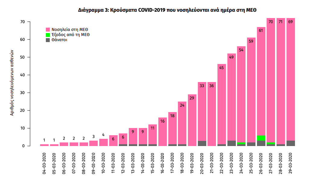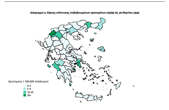 Στην τελευταία έκθεση του Εθνικού Οργανισμού Δημόσιας Υγείας (ΕΟΔΥ) εμφανίζεται η πορεία της εξάπλωσης της νόσου COVID-19, που προκαλεί ο νέος κορωνοϊός στην Ελλάδα, μέχρι τις 29 Μαρτίου.