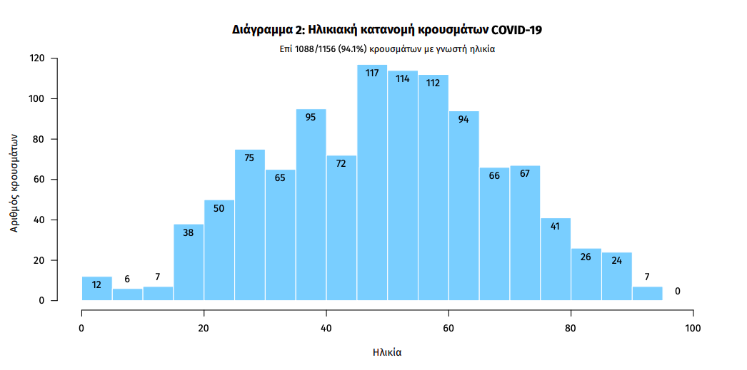 Στην ηλικιακή κατανομή των κρουσμάτων, συγκεκριμένα επικρατεί η ηλικία των 45-50 ετών με 117 καταγεγραμμένα κρούσματα, ακολουθεί η ηλικία 50-55 ετών με 114 κρούσματα και τέλος η ηλικία 55-60 ετών, με 112 επιβεβαιωμένα κρούσματα του ιού.