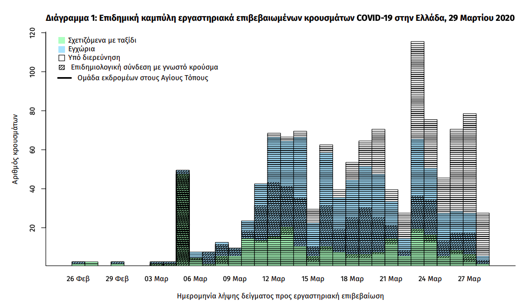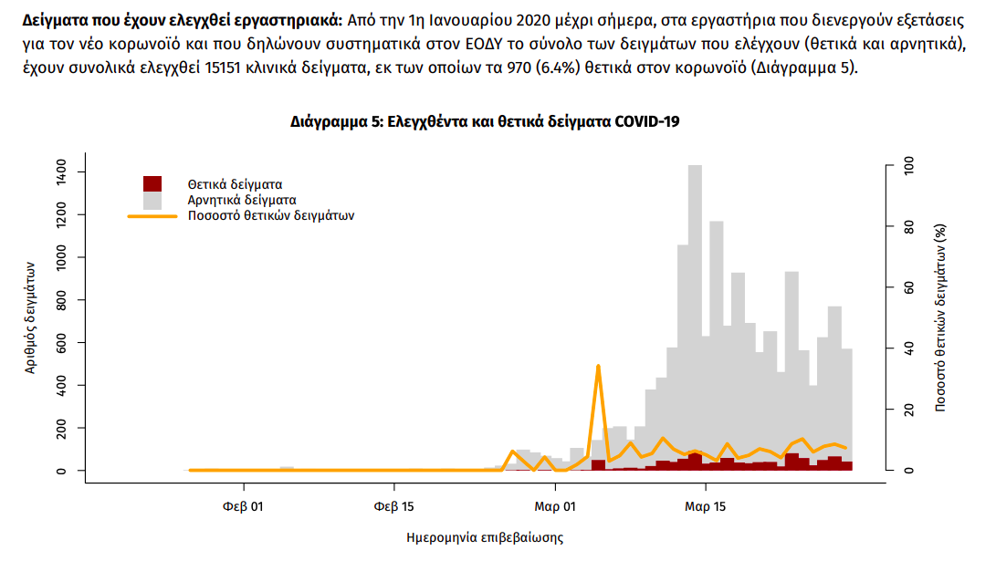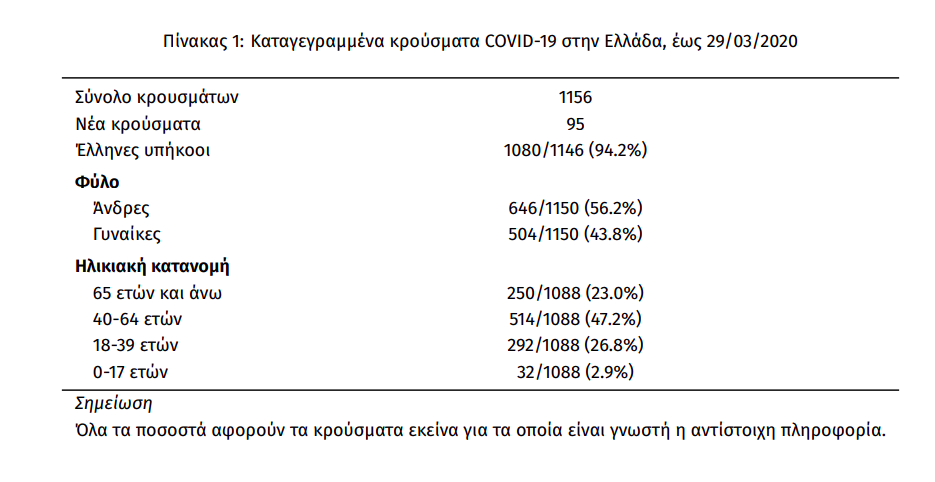 Η καταγραφή των επιστημόνων του ΕΟΔΥ έγινε επί συνόλου 1156 κρουσμάτων. Ωστόσο, από την 1η Ιανουαρίου 2020 έως τις 29 Μαρτίου 2020, στα εργαστήρια που διενεργούν εξετάσεις για τον νέο κορωνοϊό ελέγχθηκαν συνολικά 15.151 κλινικά δείγματα, εκ των οποίων τα 970 (6,4%) ήταν θετικά στον κορωνοϊό.