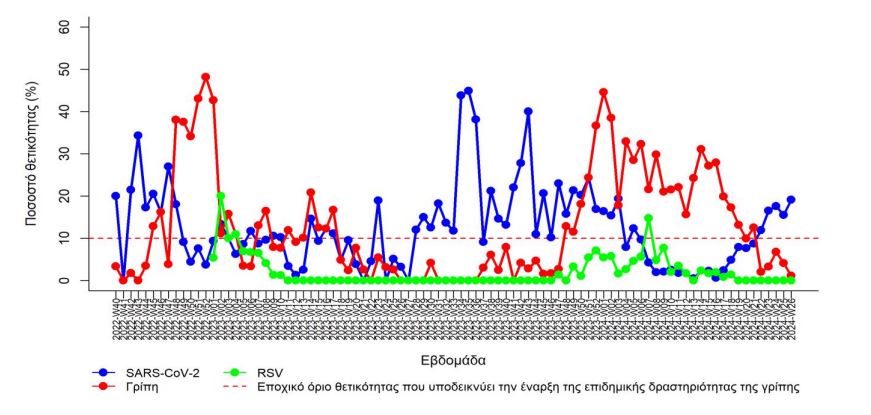 Δείτε στο διάγραμμα του ΕΟΔΥ την πορεία της θετικότητας COVID-19 στο σύνολο των υγειονομικών μονάδων της χώρας: