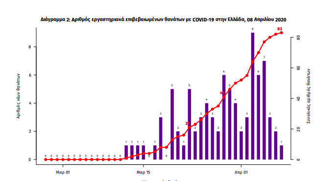 Οι νέοι θάνατοι ασθενών με COVID-19 είναι 2, ενώ από την έναρξη της επιδημίας έχουν καταγραφεί συνολικά 83 θάνατοι. Η μέση ηλικία των ασθενών που απεβίωσαν είναι 74 έτη. Ο αριθμός των ασθενών που νοσηλεύονται διασωληνωμένοι είναι 84 (79.8% άνδρες).