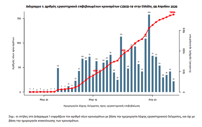 Τα νέα επιβεβαιωμένα εργαστηριακά κρούσματα της νόσου είναι 52. Ο συνολικός αριθμός των κρουσμάτων ανέρχεται σε 1884 (ημερήσια μεταβολή +2.8%), εκ των οποίων 57.0% άνδρες.