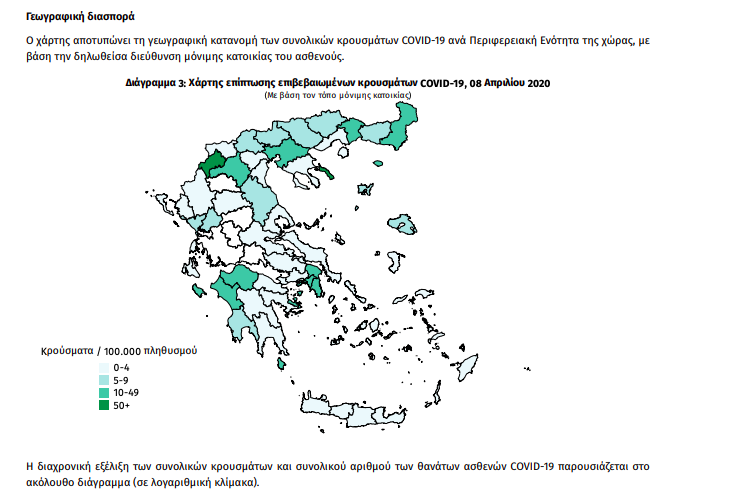 Σύμφωνα με την τελευταία επιδημιολογική έκθεση που δημοσίευσε ο ΕΟΔΥ, ο κορωνοϊός στη χώρα μας ακολουθεί ομαλό ρυθμό διάδοσης. Τα στοιχεία που παρουσιάζονται αφορούν περιστατικά από την επιδημιολογική επιτήρηση της νόσου από το νέο κορωνοϊό (COVID19), με βάση τα δεδομένα που έχουν δηλωθεί στον ΕΟΔΥ και καταγραφεί μέχρι τις 08 Απριλίου 2020 (ώρα 15:00).