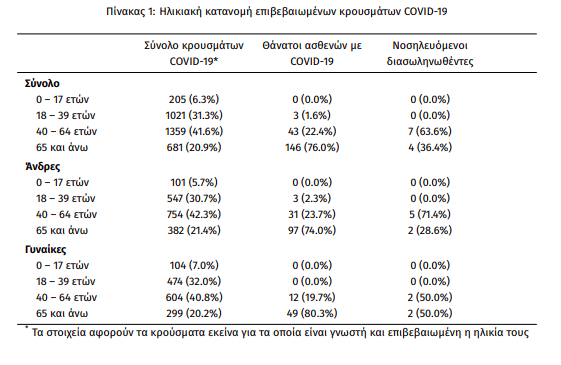 Η ηλικιακή κατανομή των (α) συνολικών κρουσμάτων, (β) των περιστατικών που κατέληξαν σε θάνατο και (γ) των ασθενών που νοσηλεύονται διασωληνωμένοι, είναι η ακόλουθη: