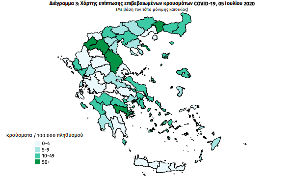 Από το σύνολο των 3519 κρουσμάτων, 816 (23.2%) θεωρούνται σχετιζόμενα με ταξίδι από το εξωτερικό, 1933 (54.9%) είναι σχετιζόμενα με ήδη γνωστό κρούσμα και τα υπόλοιπα δεν σχετίζονται ούτε με ταξίδι ούτε με άλλο γνωστό κρούσμα ή είναι ακόμα υπό διερεύνηση.