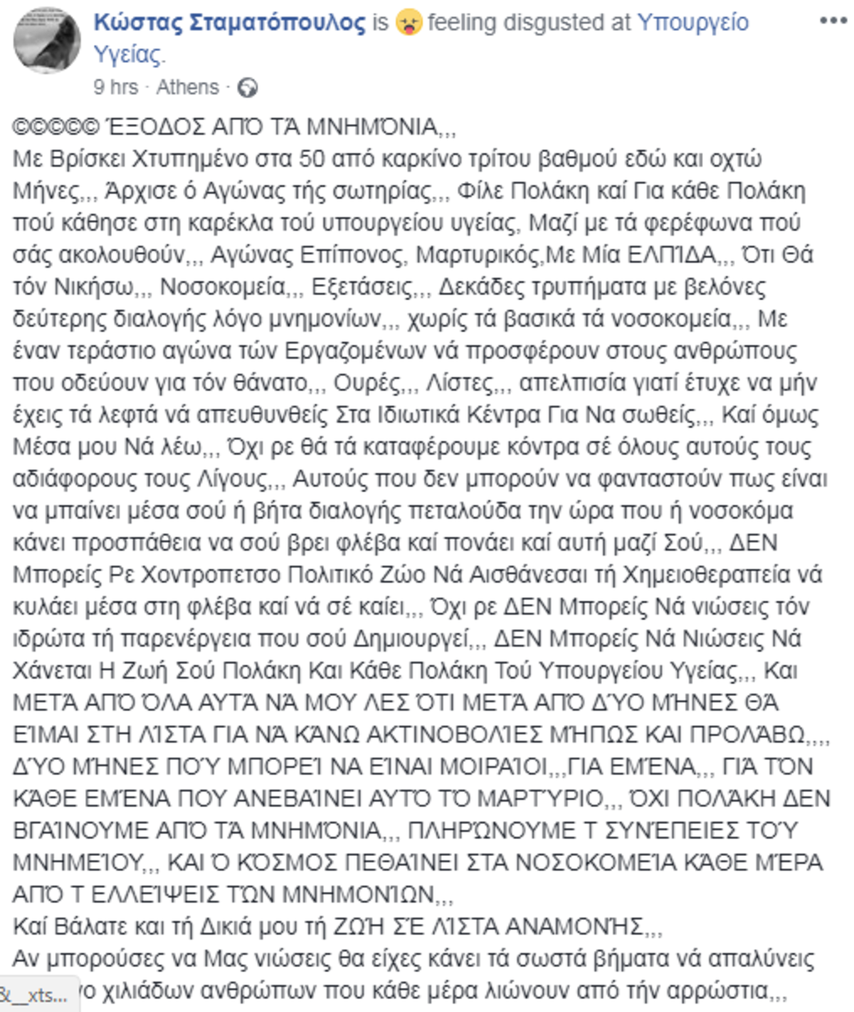 Κραυγή αγωνίας και θυμού από καρκινοπαθή: «Όχι Πολάκη. Δεν βγαίνουμε από τα μνημόνια. Πληρώνουμε τις συνέπειες»