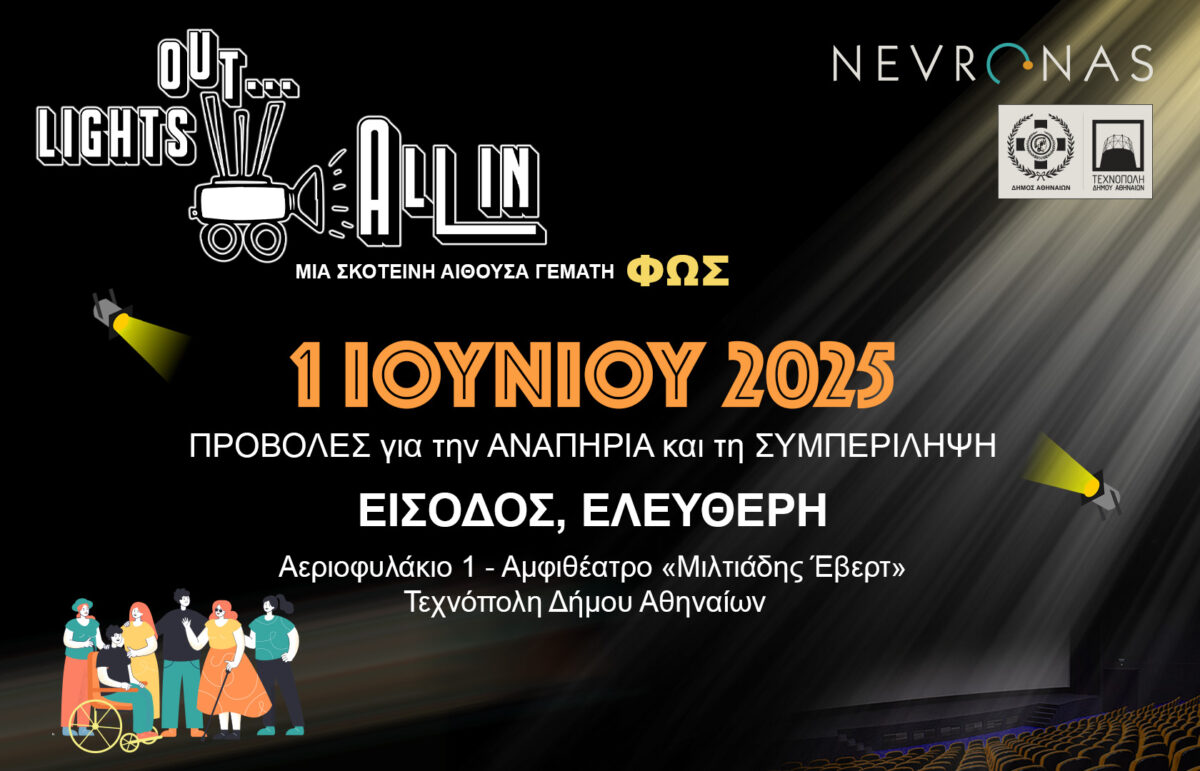 Σήμερα Κυριακή 1 Ιουνίου, το αμφιθέατρο Μιλτιάδης Έβερτ στην Τεχνόπολη φιλοξενεί την πρώτη διοργάνωση του “Lights Out, All In!”, μια νέα ανοιχτή κινηματογραφική εκδήλωση για όλη την οικογένεια με επίκεντρο την αναπηρία και τη συμπερίληψη.
