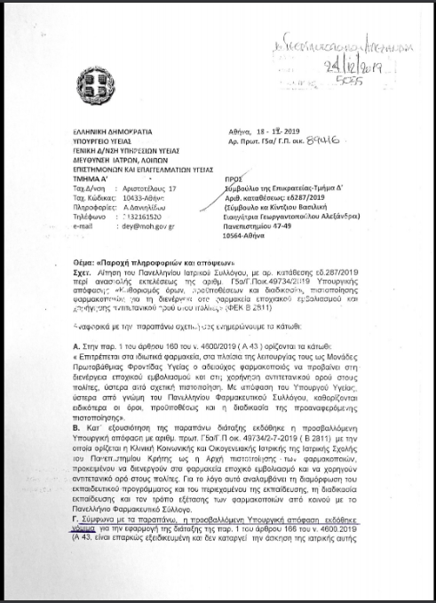 Την ίδια στιγμή, οι φαρμακοποιοί προχωρούν στην πιστοποίηση τους μέσω της ειδικής ηλεκτρονικής πλατφόρμας εκπαίδευσης, την οποία διαχειρίζεται ως Αρχή πιστοποίησης, η Ιατρική Σχολή του Πανεπιστημίου Κρήτης. Το Υπουργείο Υγείας δηλώνει δε, ότι η σχετική απόφαση του προηγούμενου Υπουργού Υγείας, Ανδρέα Ξανθού “εκδόθηκε νόμιμα και σε καμία περίπτωση δεν θίγει τα συμφέροντα των γιατρών”.