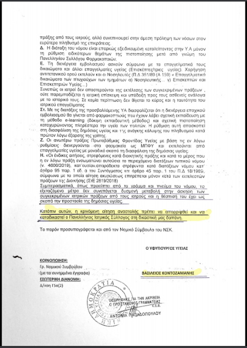 “Οι ιατροί δεν αποστερούνται της εκτέλεσης των συγκεκριμένων πράξεων, ούτε παρεμποδίζεται η ιατρική επίσκεψη και υπόδειξη προς τους ασθενείς, ανάλογα με το ιστορικό τους. Σε καμία περίπτωση δεν θίγεται το κύριος και η ταυτότητα του ιατρικού επαγγέλματος (…) το μέτρο δεν συνεπάγεται δυσμενή μεταβολή στην άσκηση των ιατρικών πράξεων από τους γιατρούς και η θέσπισή του έχει ως σκοπό την προστασία της δημόσιας υγείας”.