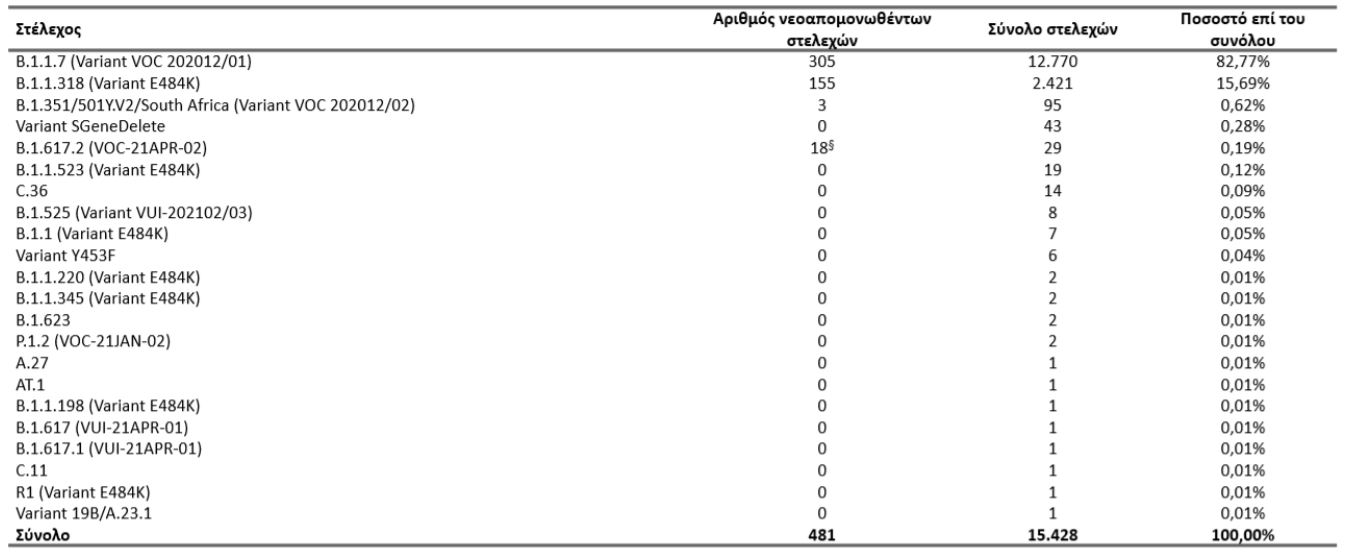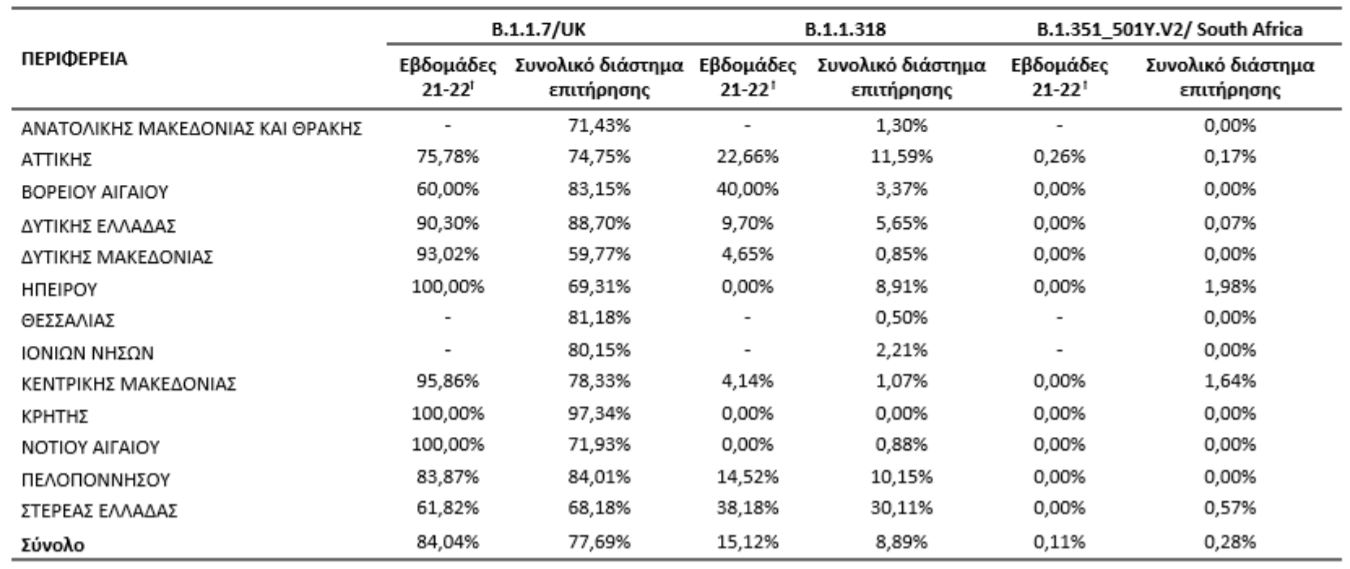 Δείτε τον σχετικό πίνακα με τα ποσοστά των μεταλλαγμένων στελεχών ανά την Ελλάδα: