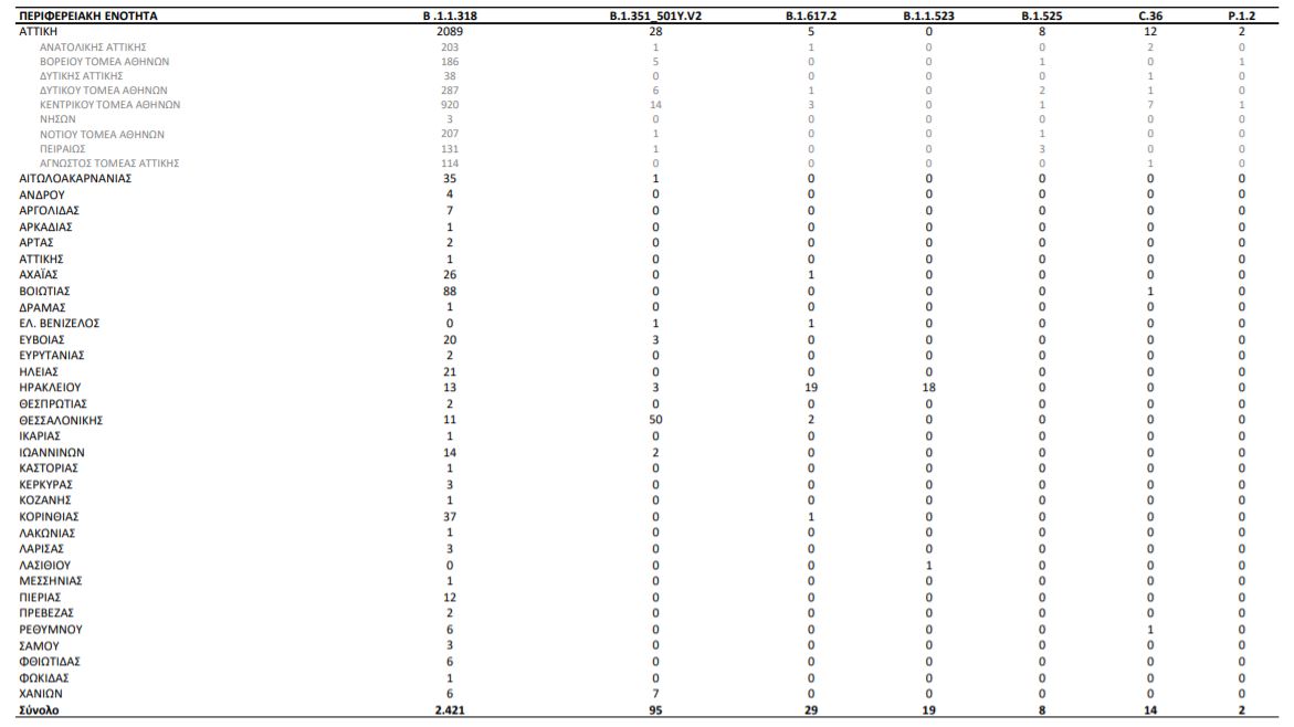 Δείτε τον αναλυτικό πίνακα του ΕΟΔΥ με τα μεταλλαγμένα κρούσματα αυξημένου ενδιαφέροντος που έχουν εντοπιστεί και χρήζουν άμεσης λήψης μέτρων ελέγχου, ανά Περιφερειακή Ενότητα, σε όλη την Ελλάδα:
