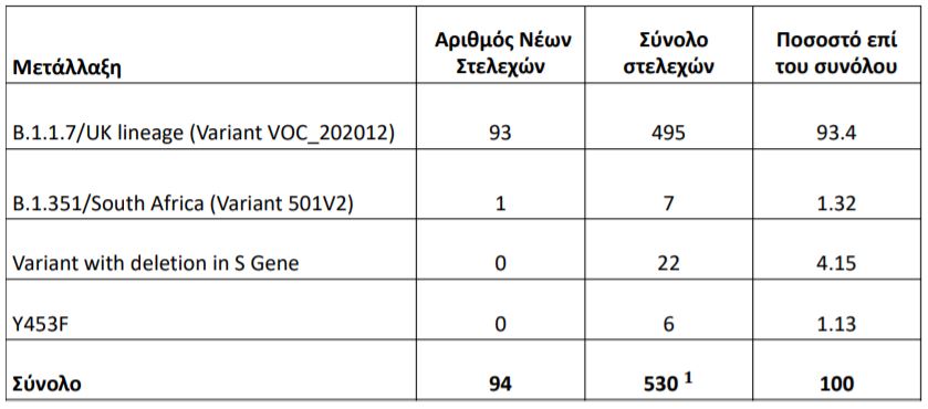 Συνολικά έχουν ταυτοποιηθεί μέχρι σήμερα στη χώρα μας 495 θετικά στελέχη της μετάλλαξης της Μεγάλης Βρετανίας και 9 της μετάλλαξης της Νότιας Αφρικής.