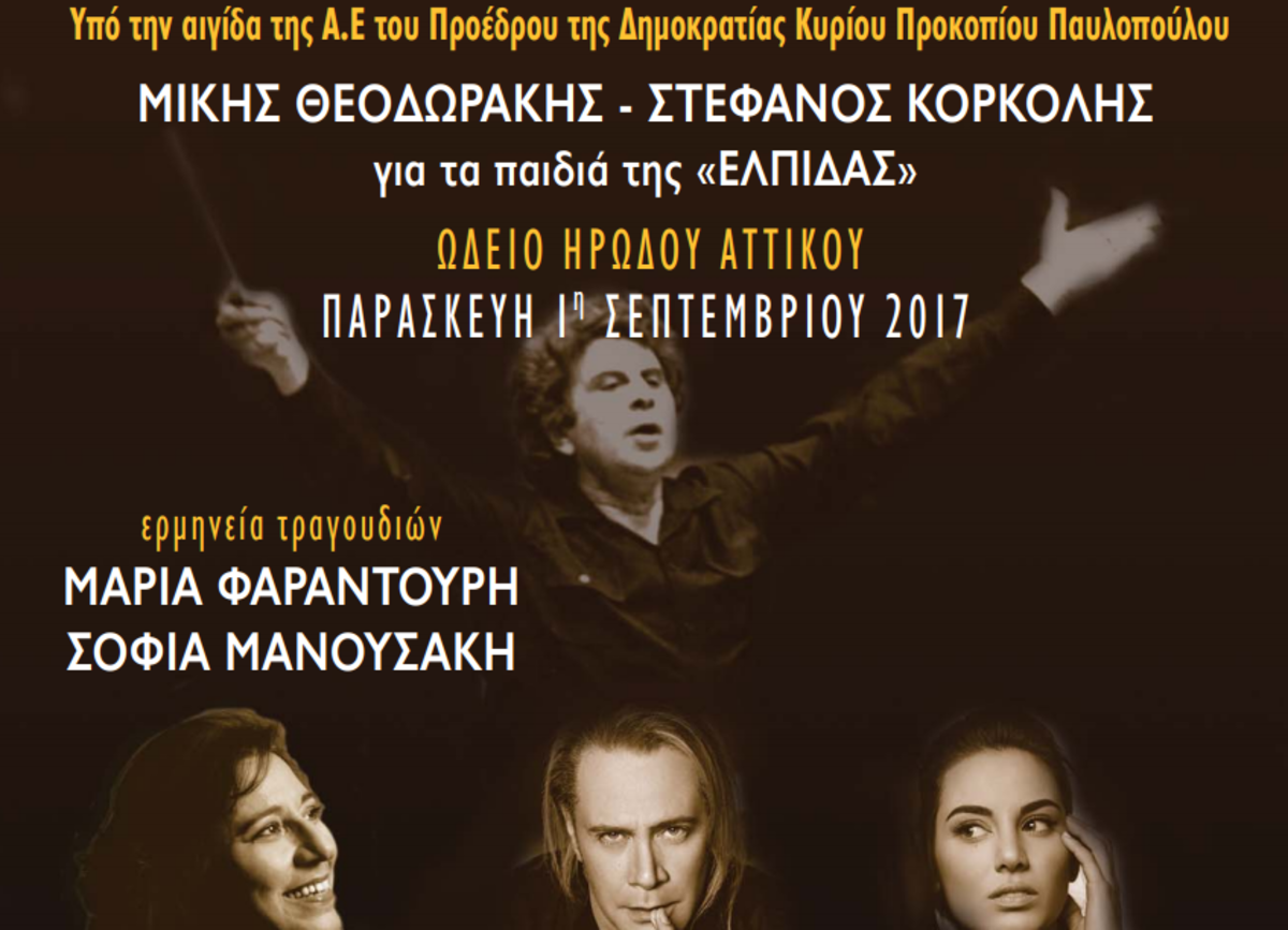 Μια εκδήλωση πολιτισμού, τέχνης και ανθρωπιάς κάτω από τον ιερό βράχο της Ακρόπολης: Ο διεθνούς φήμης πιανίστας και συνθέτης Στέφανος Κορκολής με τη μοναδική Μαρία Φαραντούρη και την εξαιρετική ερμηνεύτρια Σοφία Μανουσάκη μας ταξιδεύουν στα συγκλονιστικά μουσικά μονοπάτια του οικουμενικού μας μουσουργού Μίκη Θεοδωράκη για τα παιδιά της «ΕΛΠΙΔΑΣ».