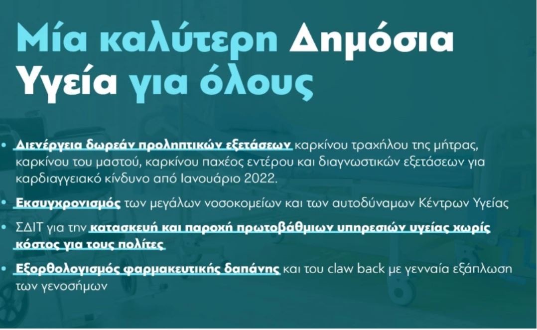 Σημαντικές παρεμβάσεις για την αναβάθμιση της δημόσιας Υγείας μέσα στο 2022 και κίνητρα για τον εμβολιασμό των νέων, εξήγγειλε ο πρωθυπουργός Κυριάκος Μητσοτάκης. Στην ομιλία του, στο πλαίσιο της 85ης ΔΕΘ υποσχέθηκε αναβάθμιση της Πρωτοβάθμιας Φροντίδας Υγείας, και έκανε λόγο για «περισσότερα αυτοδύναμα Κέντρα Υγείας και δωρεάν προληπτικές εξετάσεις για όλο τον πληθυσμό».