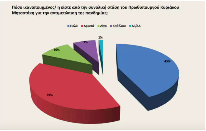 Η δημοσκόπηση της Opinion Poll που διεξήχθη από 7 έως 9 Μαΐου, ανάμεσα σε δείγμα 1.080 ατόμων, δίνει το 43% των θετικών απανρήσεων στην ερώτηση «Πόσο ικανοποιημένος/ η είστε από την συνολική στάση του Πρωθυπουργού Κυριάκου Μητσοτάκη για την αντιμετώπιση της πανδημίας». Το 39%, επίσης, απαντά «αρκετά», με το σύνολο των δυο απαντήσεων να είναι 82%. Το 10% απαντά «λίγο» και το 7% «καθόλου».