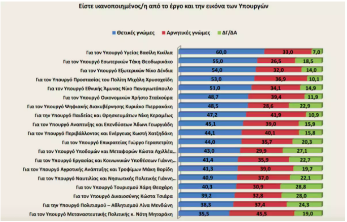 Πιο δημοφιλής υπουργός είναι ο Βασίλης Κικίλιας με 60% θετικές γνώμες και (στην πρώτη 10αδα) τον ακολουθούν: Τάκης Θεοδωρικάκος, Νίκος Δένδιας, Μιχάλης Χρυσοχοΐδης, Νίκος Παναγιωτόπουλος, Χρήστος Σταϊκούρας, Κυριάκος Πιερρακάκης, Νίκη Κεραμέως, Άδωνις Γεωργιάδης, Κωστής Χατζηδάκης.