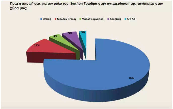 Όσο για το θετικό ποσοστό που συγκεντρώνει ο λοιμωξιολόγος και υπεύθυνος επικοινωνίας για τον νέο κορωνοϊό, Σωτήρης Τσιόδρας, σχετικά με τον ρόλο του στην πανδημία; Οι απαντήσεις «θετική άποψη» μαζί με «μάλλον θετική» συγκεντρώνουν το συντριπτικό ποσοστό του 89%. Το 4% του ποσοστού των πολιτών απαντά «μάλλον αρνητική» και το 5% «αρνητική».