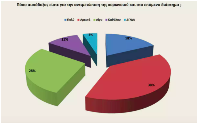 Παράλληλα το 40% αισθάνεται «λίγη» ή «καθόλου αισιοδοξία» για την αντιμετώπιση της πανδημίας το επόμενο διάστημα, αντίθετα από το 56% που δηλώνει αισιόδοξο.