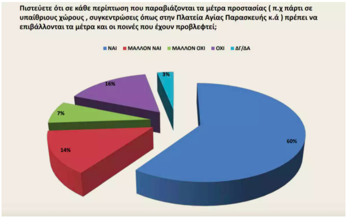 Αυστηροί είναι οι συμπολίτες μας ως προς τις συγκεντρώσεις στις πλατείες και τα γεγονότα με τον συνωστισμό πολιτών στην Αγία Παρασκευή. Στην ερώτηση, εάν θα πρέπει να επιβάλλονται ποινές όταν παραβιάζοντα τα μέτρα προστασίας «Ναι» απάντησε το 60%, το 14% «μάλλον ναι», το 16% «όχι» και το 7% «μάλλον όχι».