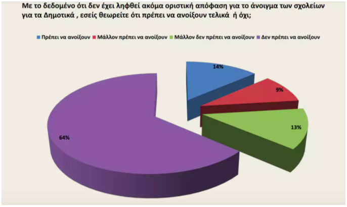 «Όχι στο άνοιγμα των Δημοτικών Σχολείων», λέει ωστόσο, η πλειοψηφία των πολιτών. Στην ερώτηση, εάν θα πρέπει να ανοίξουν και πάλι τα Δημοτικά Σχολεία, το 64% απαντά «Όχι» και το 13%«μάλλον όχι» , ενώ υπέρ του να επιστρέψουν στα θρανία οι μαθητές του δημοτικού είναι το 23% (14% απάντησε πως πρέπει να γυρίσουν και 9% πως μάλλον πρέπει).