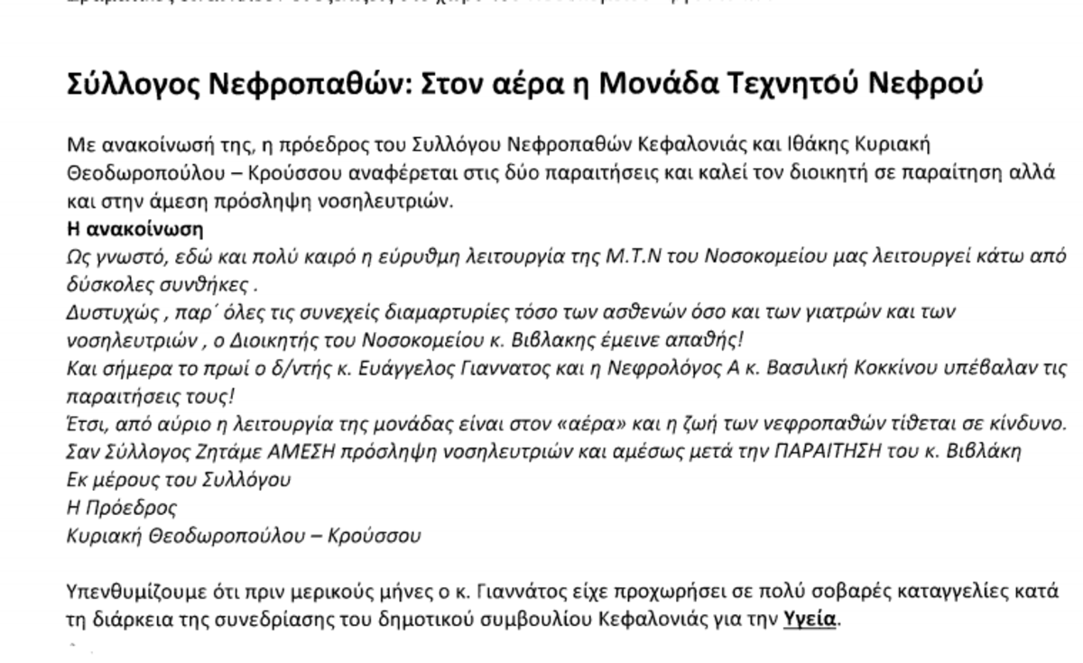 «Παρ’όλες τις διαμαρτυρίες τόσο των ασθενών, όσο και των γιατρών και των νοσηλευτριών, ο Διοικητής του νοσοκομείου κ.Βιβλάκης έμεινε απαθής! Και σήμερα το πρωί ο Δ/ντης κ. Ευάγγελος Γιαννάτος και η Νεφρολόγος Α’ κα. Βασιλική Κοκκίνου υπέβαλλαν τις παραιτήσεις τους. Ετσι από αύριο η λειτουργία της Μονάδας είναι στον «αέρα» και η ζωή των νεφροπαθών τίθεται σε κίνδυνο. Ως Σύλλογος ζητάμε άμεση πρόσληψη των νοσηλευτριών και αμέσως μετά την ΠΑΡΑΙΤΗΣΗ του κ. Βιβλάκη», καταλήγουν οι ασθενείς.