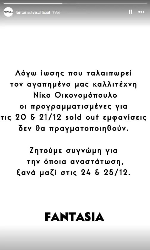 «Λόγω ίωσης που ταλαιπωρεί τον αγαπημένο μας καλλιτέχνη, Νίκο Οικονομόπουλο, οι προγραμματισμένες για τις 20 και 21/12 sold out εμφανίσεις, δε θα πραγματοποιηθούν. Ζητούμε συγγνώμη για την όποια αναστάτωση. Ξανά μαζί 24 και 25/12» αναφέρει η ανακοίνωση του νυχτερινού κέντρου.