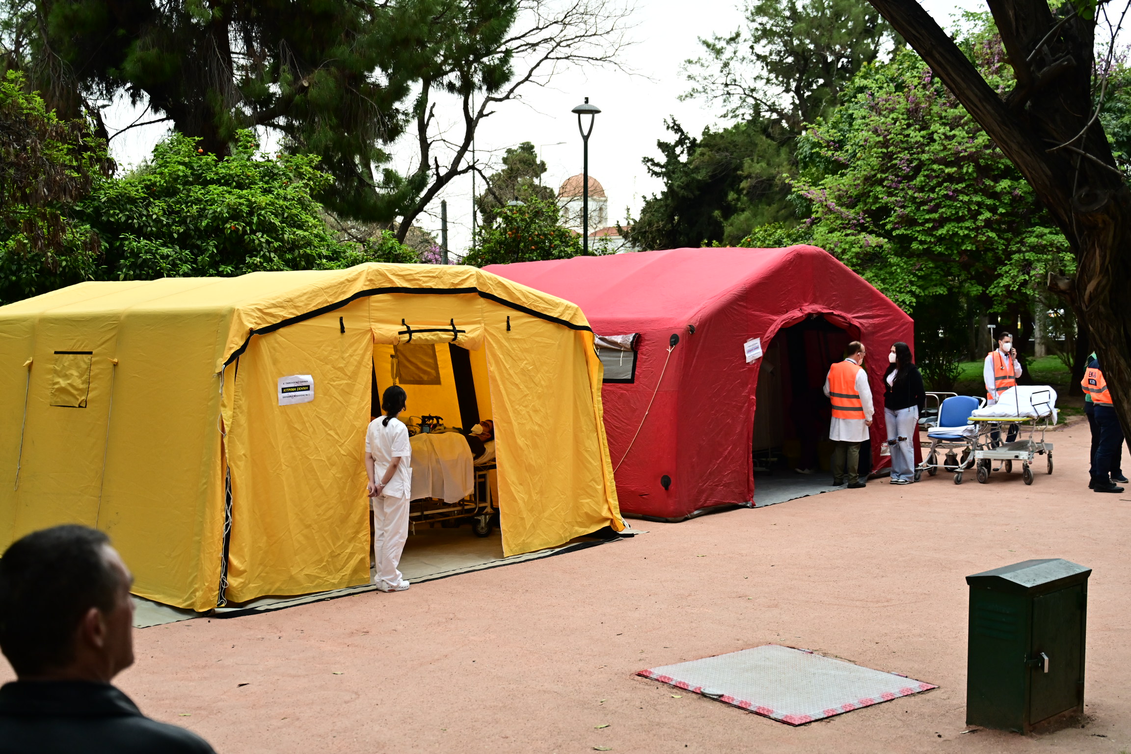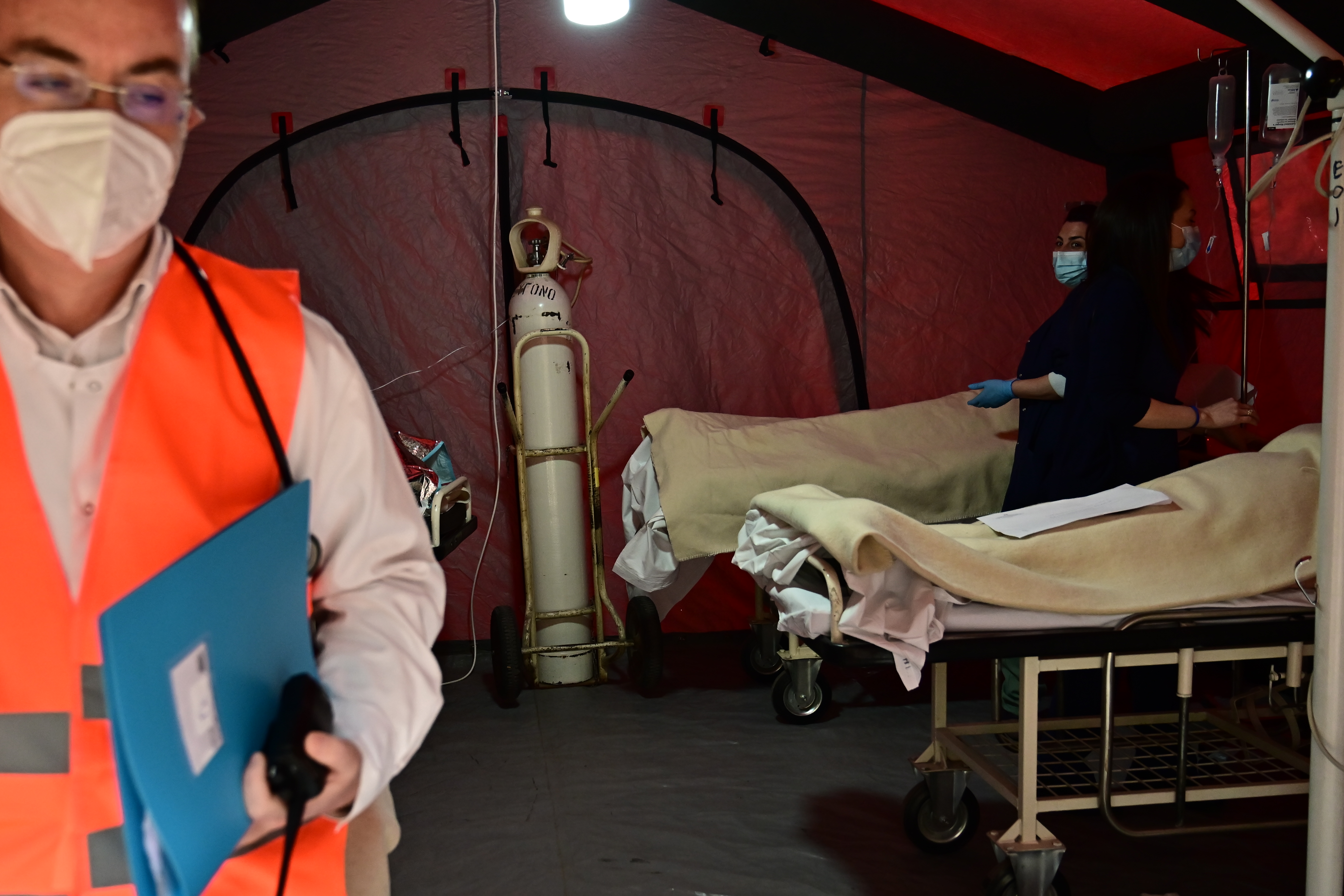 Σε αυτές τις σκηνές είχαν ήδη μεταφερθεί από την αρμόδια ομάδα του νοσοκομείου ιατροτεχνολογικός εξοπλισμός, υγειονομικό υλικό, ιατρικοί φάκελλοι, ιματισμός, ενώ μπροστά από το κτίριο είχαν στηθεί και χημικές τουαλέτες.