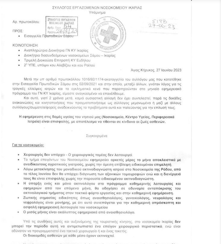 Η καταγγελία του συλλόγου μάλιστα στον Εισαγγελέα κάνει λόγο για «τραγικές ελλείψεις γιατρών και τα εγκληματικά κενά που παρατηρούνταν στο μηνιαίο εφημερειακό πρόγραμμα του ΓΝ ΚΥ Ικαρίας».