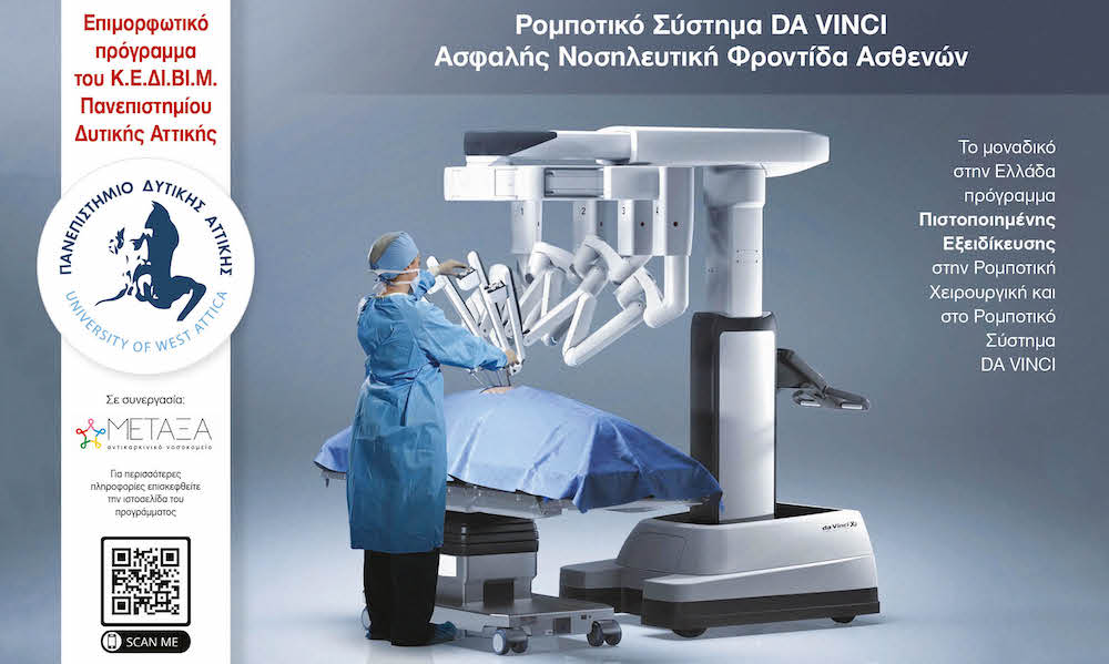 Άμεσα θα ξεκινήσει η υλοποίηση του εκπαιδευτικού προγράμματος με τίτλο «Ρομποτικό Σύστημα Da Vinci – Ασφαλής Νοσηλευτική Φροντίδα Ασθενών», μια πρωτοβουλία του Ιατρού κ. Όθωνα Μανωλάκου και με επιστημονικά υπεύθυνη την Αναπλ. Καθηγήτρια του Τμήματος Νοσηλευτικής Γεωργία Τουλιά – Τσάβαλου.