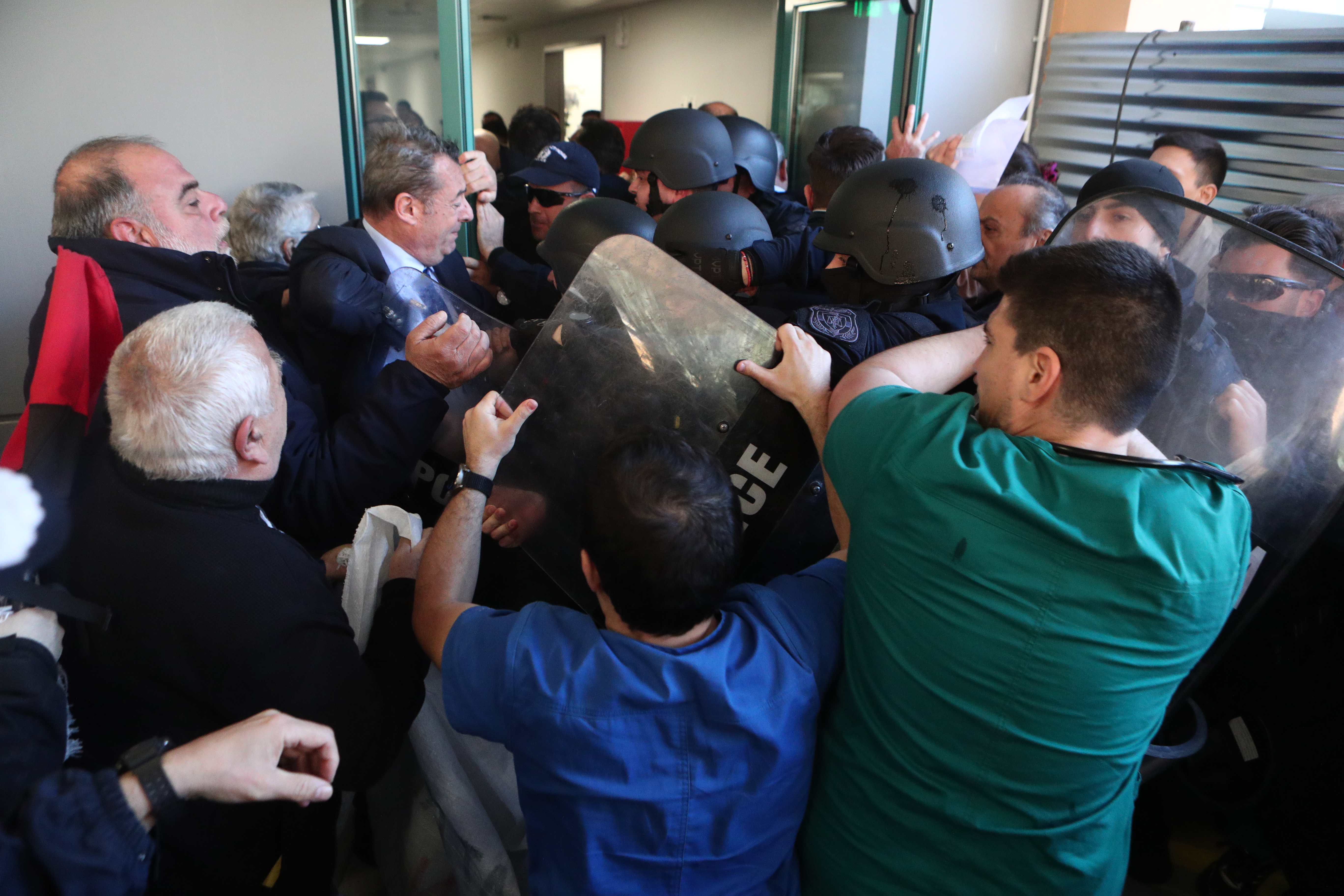 Τα πλάνα κατά την άφιξη του υπουργού δείχνουν, βέβαια, σφοδρές εντάσεις και «μάχες» σώμα με σώμα ανάμεσα σε εργαζομένους του νοσοκομείου, νοσηλευτές και αστυνομικούς.