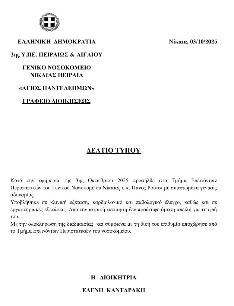«Κατά την εφημερία της 3ης Οκτωβρίου 2025 προσήλθε στο Τμήμα Επειγόντων Περιστατικών του Γενικού Νοσοκομείου Νίκαιας ο κ. Πάνος Ρούτσι με συμπτώματα γενικής αδυναμίας.
