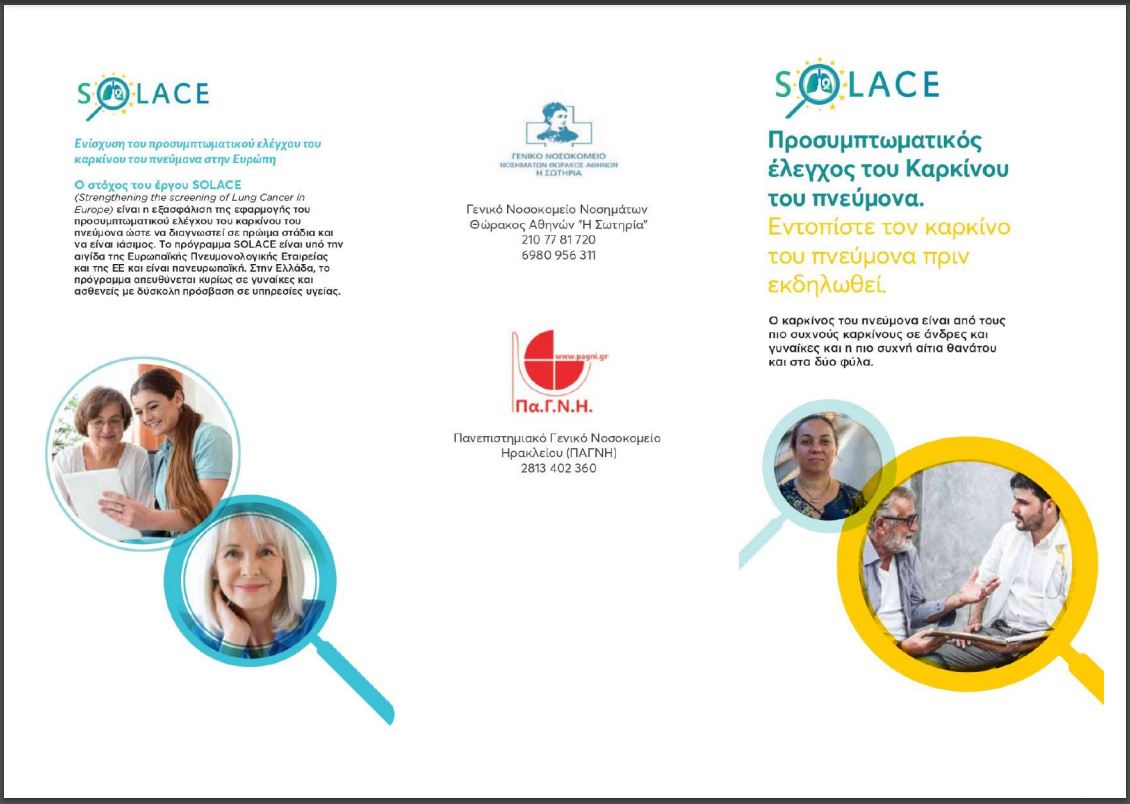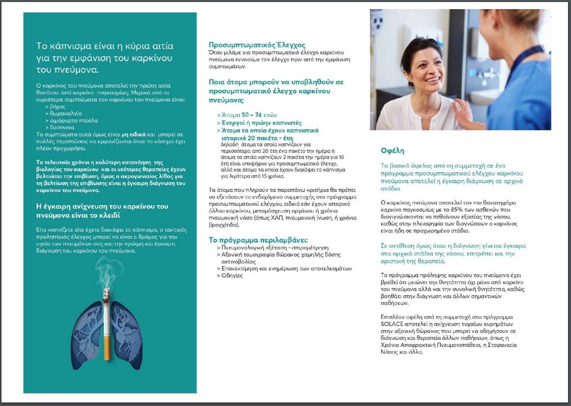 Εθελοντές, ενεργούς ή πρώην καπνιστές και κυρίως γυναίκες αναζητούν οι επιστήμονες στο Νοσοκομείο Νοσημάτων Θώρακος «η Σωτηρία», για να συμμετάσχουν σε μελέτη που διεξάγεται στο πλαίσιο ευρωπαϊκού προγράμματος «Solace», για τον προσυμπτωματικό έλεγχο του καρκίνου του πνεύμονα.