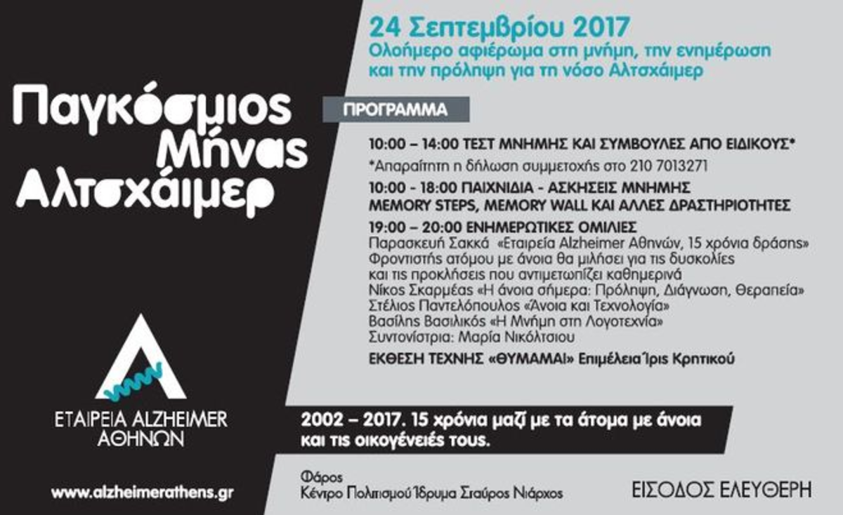 Σημειώνεται τέλος, ότι στο πλαίσιο του Παγκόσμιου Μήνα Αλτσχάιμερ, η Εταιρεία Alzheimer Αθηνών θα πραγματοποιήσει στις 24 Σεπτεμβρίου 2017 στο Κέντρο Πολιτισμού Ίδρυμα Σταύρος Νιάρχος, εκδήλωση με θέμα «Αφιέρωμα στη μνήμη, την ενημέρωση και την πρόληψη».