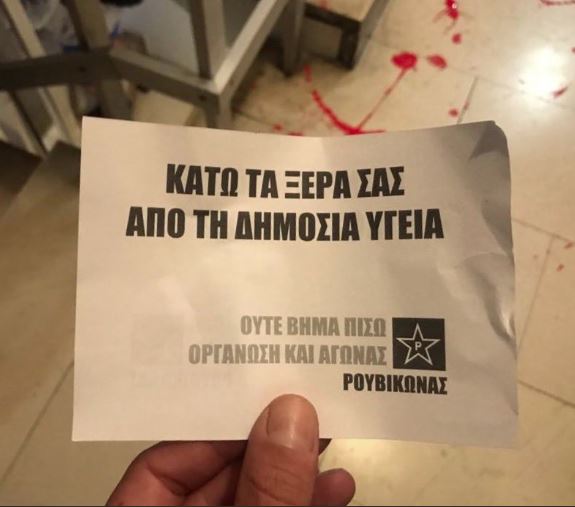 Στόχος του Ρουβίκωνα, αυτή τη φορά, το πολιτικό γραφείο του υπουργού Υγείας στην οδό Κριεζώτου 4, στο Κολωνάκι. «Δεν τρομοκρατούμαι», δηλώνει από το λογαριασμό του στο twitter, ο Βασίλης Κικίλιας.