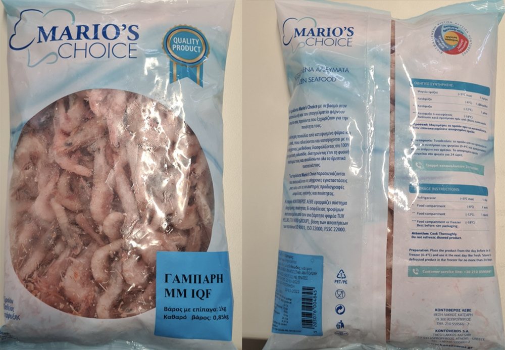 Ο ΕΦΕΤ, και συγκεκριμένα η Περιφερειακή Διεύθυνση Αττικής, κατά τη διενέργεια ελέγχων στο πλαίσιο του Προγράμματος «Επίσημος Έλεγχος για την παρακολούθηση των επιπέδων των προσθέτων τροφίμων σε αλιεύματα» έτους 2021, προέβη σε δειγματοληψία τροφίμου με τα στοιχεία: “MARIO’S CHOICE, ΓΑΜΠΑΡΗ ΑΙΓΑΙΟΥ ΜΜ IQF”, με αριθμό παρτίδας 210113001 και ημερομηνία ανάλωσης 23/11/22, βάρους με επίπαγο 1000γρ και καθ. βάρους 850 γρ., το οποίο παράγεται από την εταιρεία «ΚΟΝΤΟΒΕΡΟΣ ΑΕΒΕ.» με έδρα στον Ασπρόπυργο Αττικής.