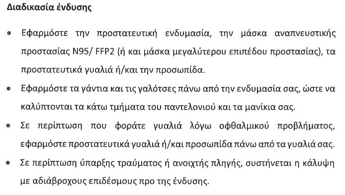 - Προστατευτική ενδυμασία. Μακρυμάνικη και αδιάβροχη ενδυμασία. Σε περίπτωση χρήσης ολόσωμης στολής πρέπει να είναι αδιάβροχη, με μακρύ μανίκι (και μανσέτα), ανθεκτική σε βαριά εργασία και κατά προτίμηση με λάστιχο στο κάτω μέρος.