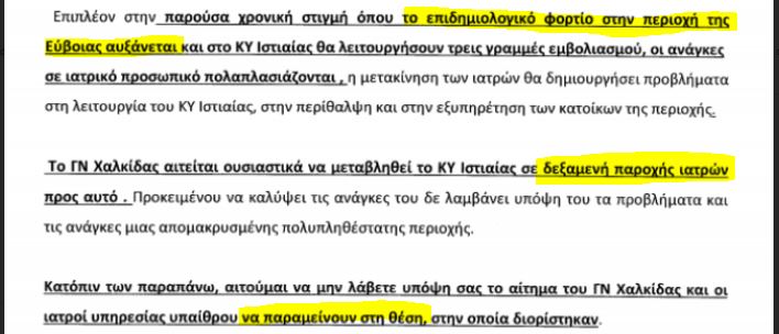 Στο ίδιο έγγραφο επισημαίνεται ότι το Κ. Υ. Ιστιαίας δεν θα πρέπει να χρησιμοποιηθεί ως «δεξαμενή παροχής ιατρών» προς το Νοσοκομείο Χαλκίδας.